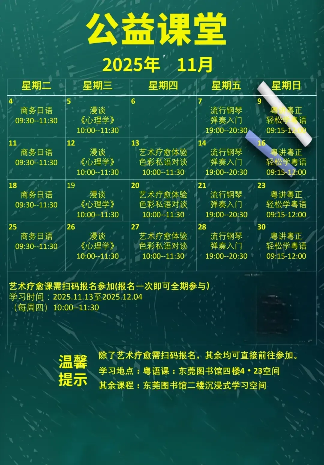 东莞图书馆公益课堂推出艺术疗愈之艺术家系列课程。这里不仅教你欣赏美,更邀请你一起“玩”艺术,在色彩与线条中,找到属于你自己的心灵解压阀,为生活充电!
